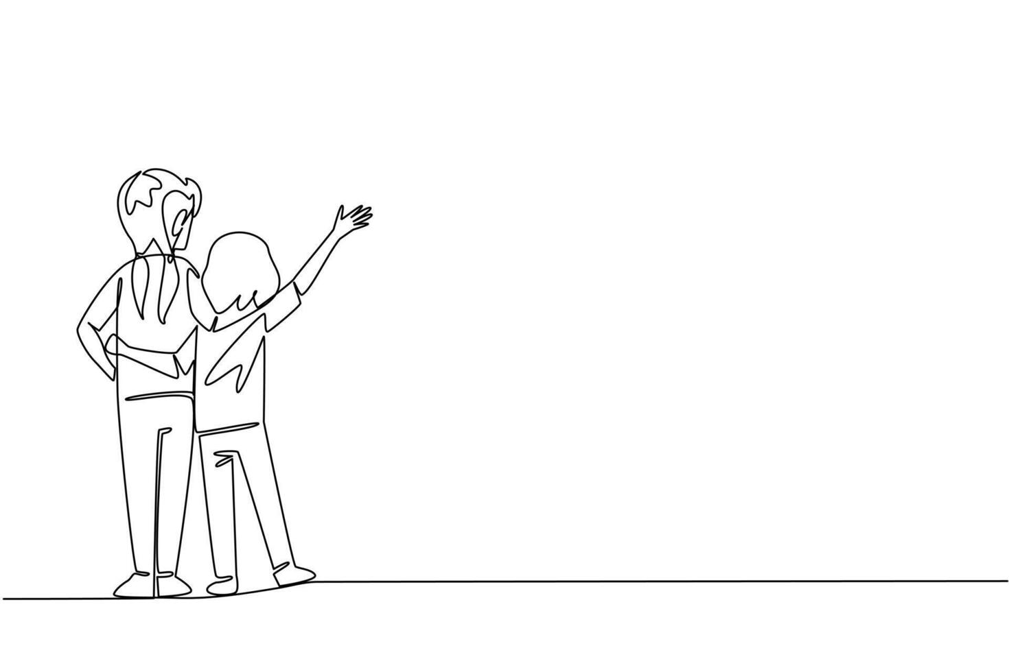 Single one line drawing rear view, two little sisters standing embracing each other. Always get along wherever. The protector. Loving. Day of Brother. Continuous line design illustration Pro Vector