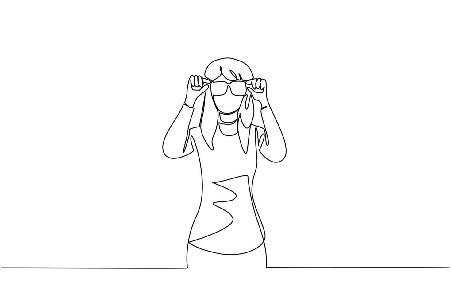 Single continuous line drawing woman dressed as a nerd, holding glasses with large frames. The most unique and ridiculous in the office. Attractive. Geek Pride Day. One line design Pro Vector