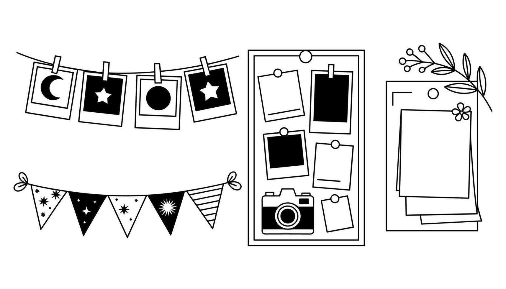 Black and white line art collection of instant photos camera and bunting flags with celestial and geometric designs Pro Vector