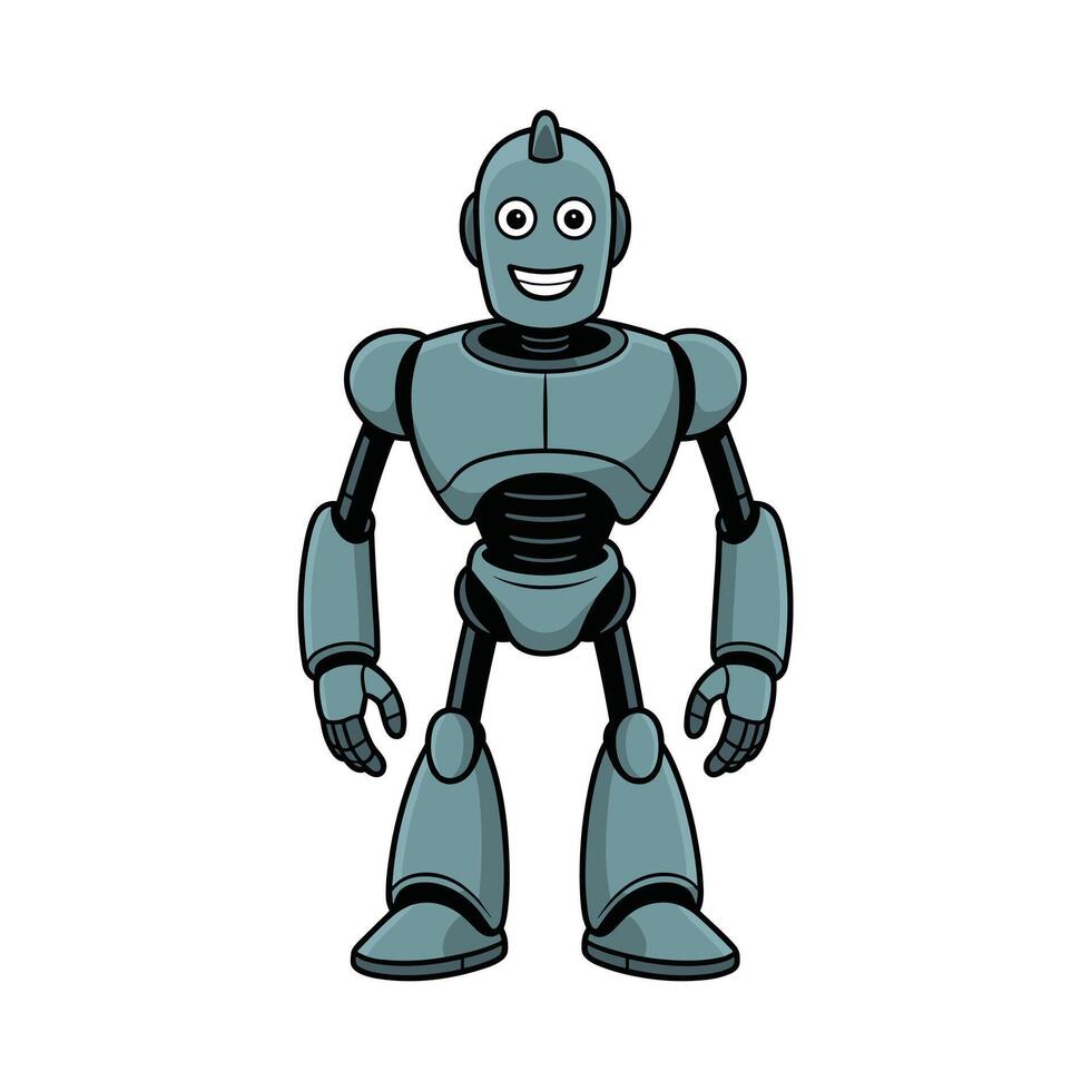 The image presents a friendly cartoon robot with a light-grey body and dark-grey joints. The robot has a cheerful smile and rounded features, standing on a white backdrop. vector