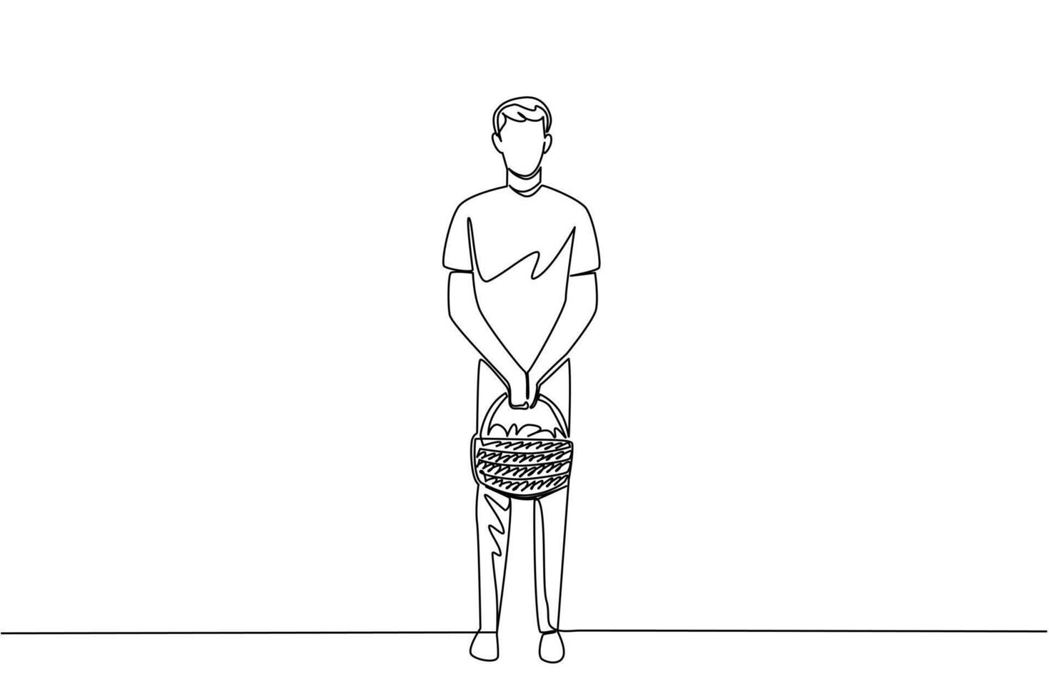 Continuous one line drawing a man carrying a rattan basket filled with mushrooms with both hands. Coming home after hunting. National Mushroom Hunting Day. Single line draw design Pro Vector