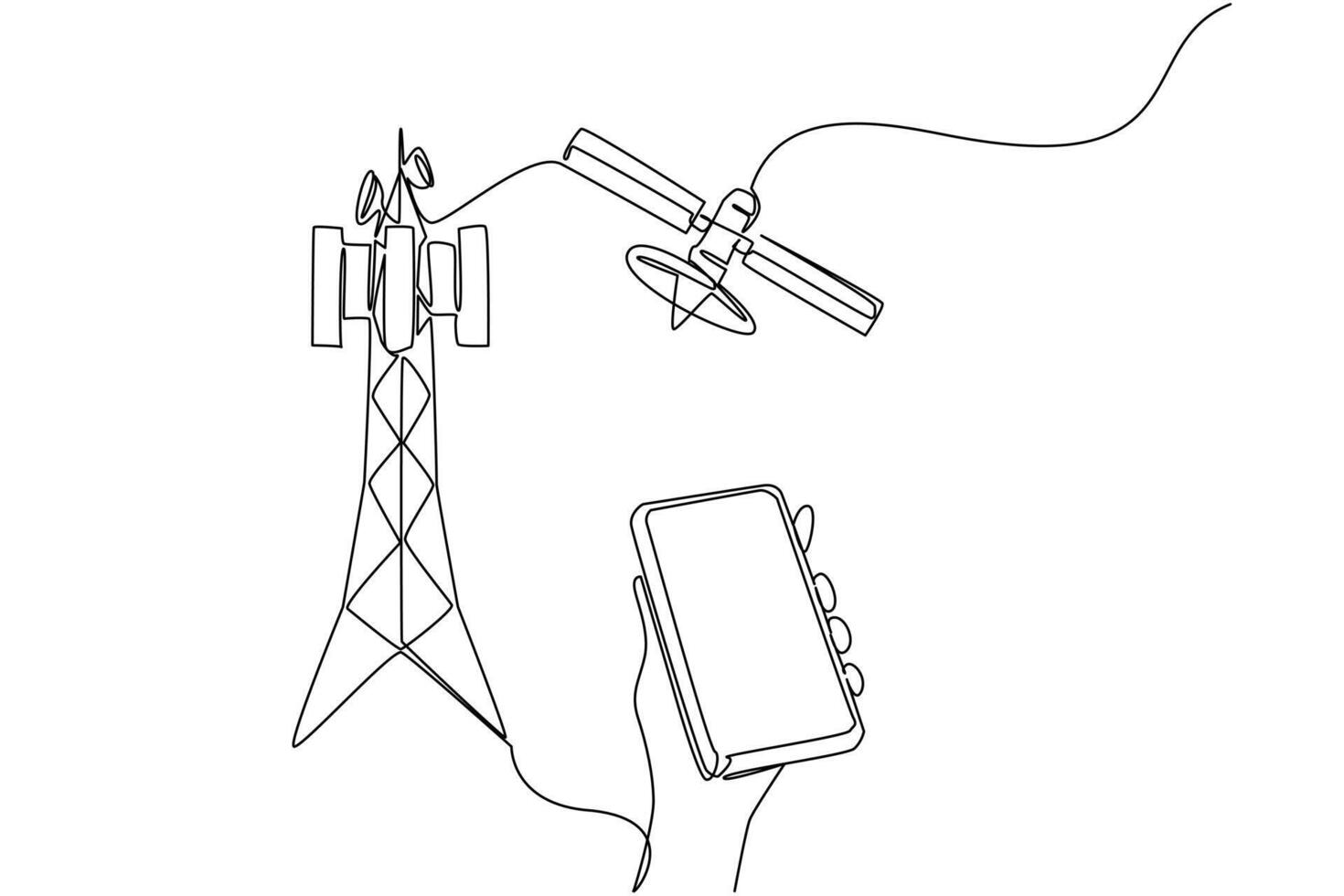Continuous one line drawing hand holds smartphone and pointing at transmitter tower. Progress of times. World Telecommunication and Information Society Day. Single line draw illustration Pro Vector