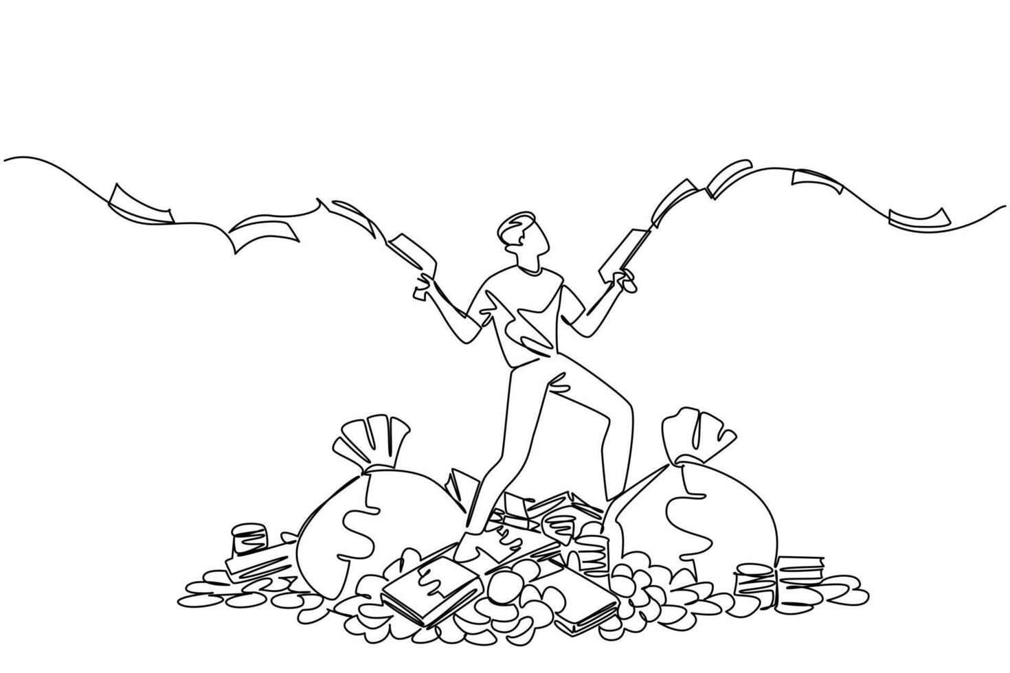Continuous one line drawing a man stands on a pile of money holds gun that shoots out banknotes in both hands. Sharing in a unique way Be a Millionaire Day. Single line draw design Pro Vector