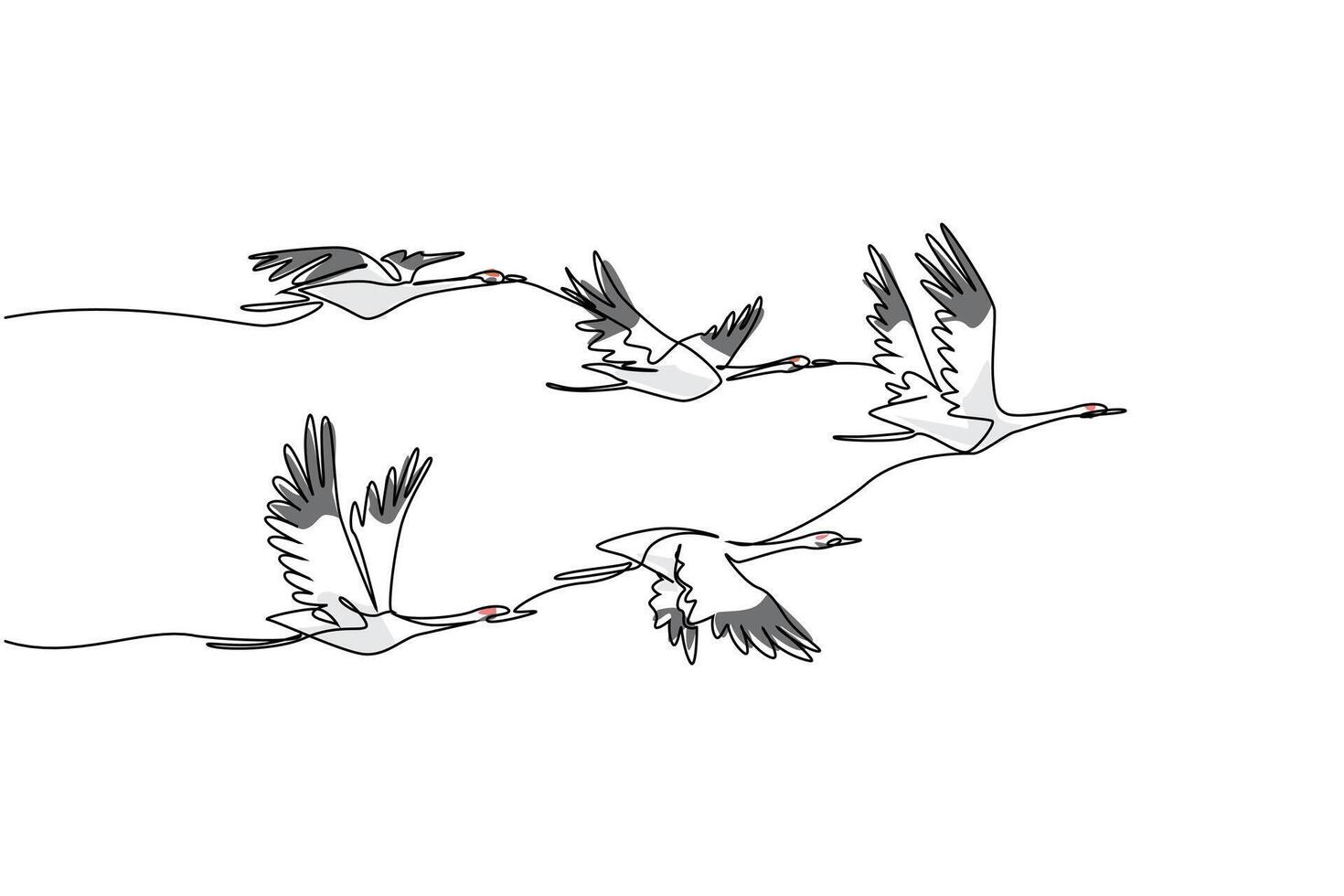 Single continuous line drawing a group of whooping cranes in flight with their wings in various positions. Formation during migration. Together. Whooping Crane Day. One line design illustration Pro Vector