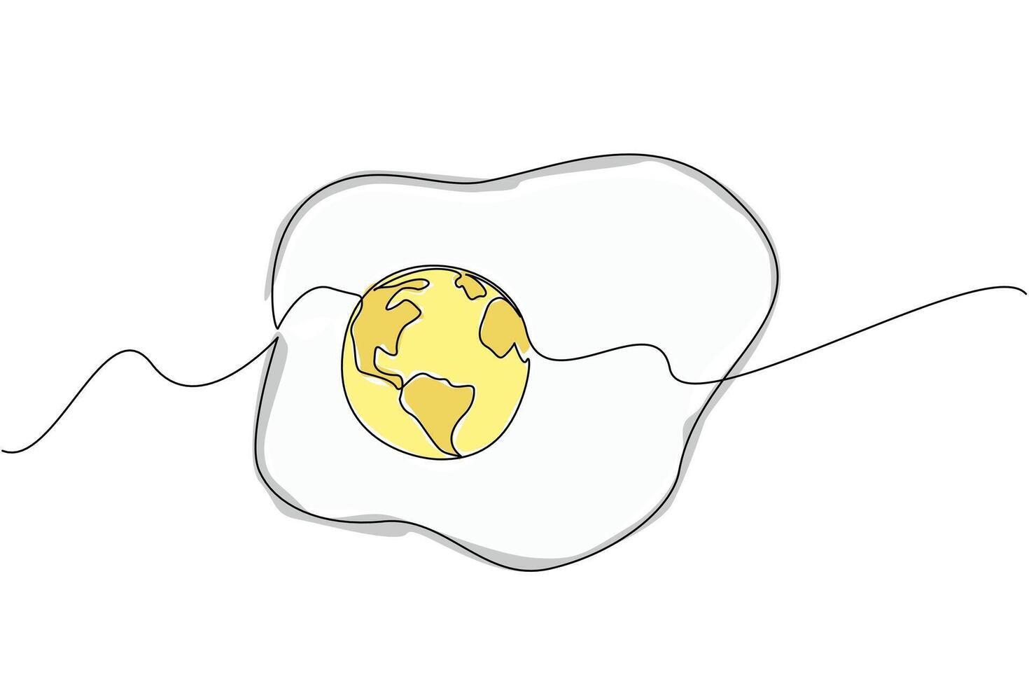 Continuous one line drawing fried egg with yolk made into globe. Good protein content in eggs. Good nutrition but not evenly distributed. World Hunger Day. Single line draw design illustration Pro Vector