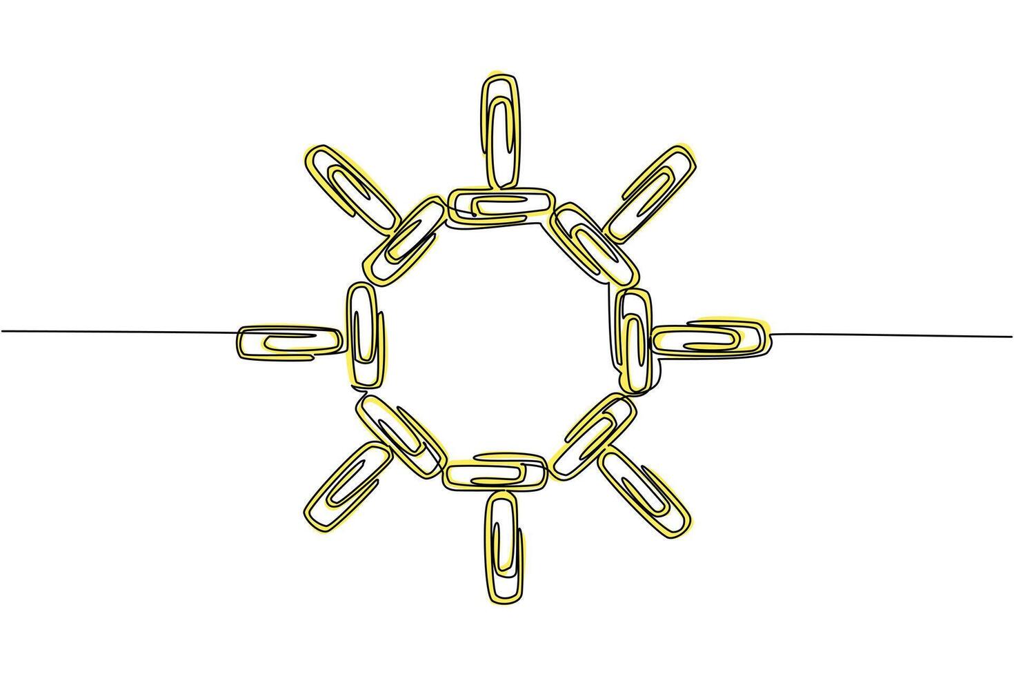 Continuous one line drawing paper clips arranged into the sun and rays around it. Symbolizing the need for paper clips in office. National Paperclip Day. Single line draw design illustration Pro Vector