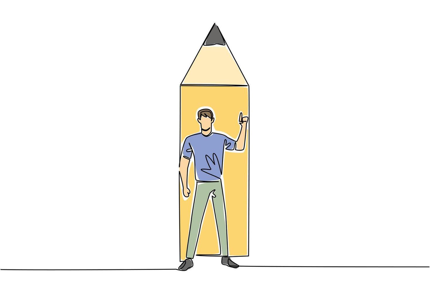 Single continuous line drawing a man standing in front of the bottom end of a pencil with a gesture. Writing solutions is the right way. National Creativity Day. One line design illustration Pro Vector