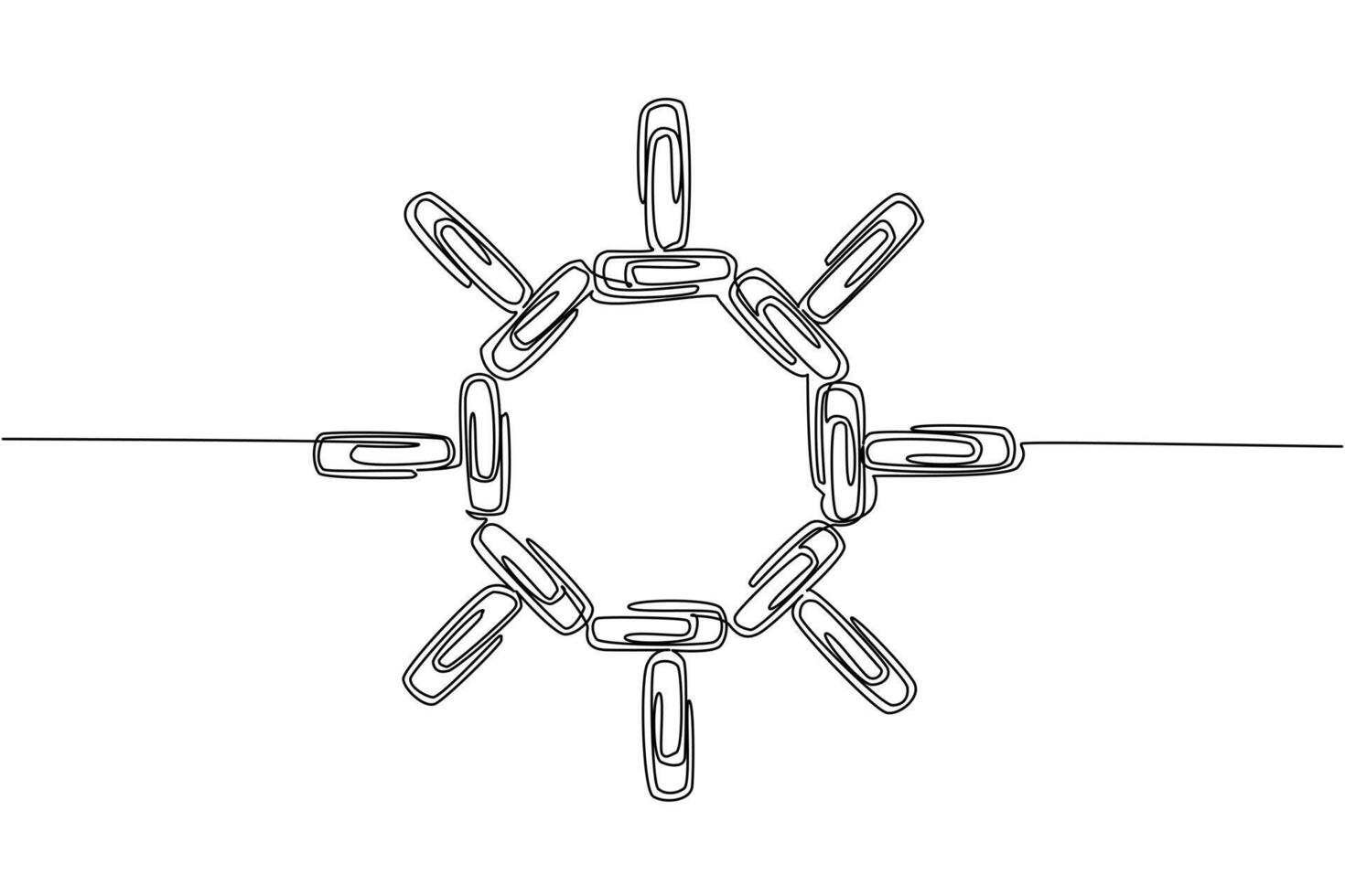 Continuous one line drawing paper clips arranged into the sun and rays around it. Symbolizing the need for paper clips in office. National Paperclip Day. Single line draw illustration Pro Vector
