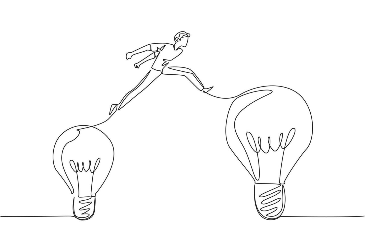 Single one line drawing a man jumps from a small lightbulb to a large light bulb. Moving freely is the result of positive thinking. National Creativity Day. Continuous line design illustration Pro Vector