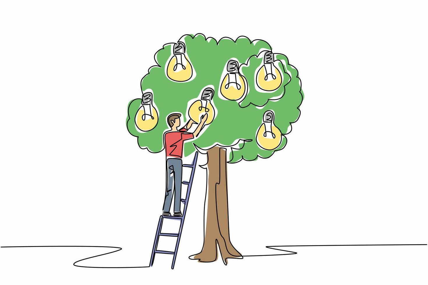 Continuous one line drawing a man climbs ladder into tree to get lightbulb and sack containing many lightbulbs. Try solve problem. National Creativity Day. Single line draw design illustration Pro Vector