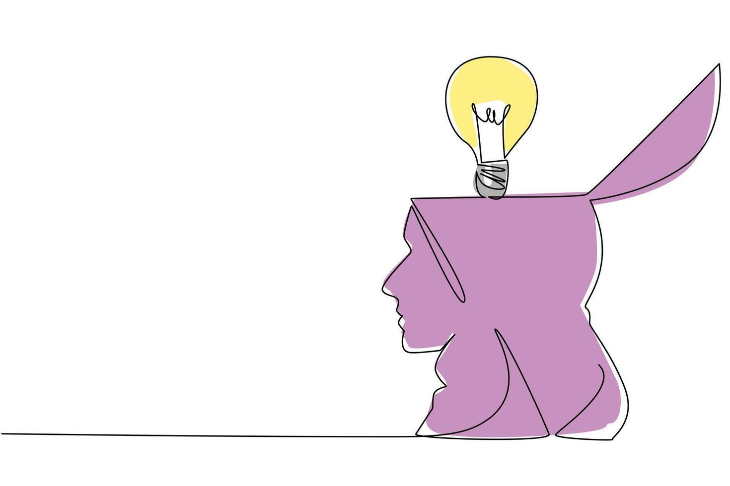 Single one line drawing the top of head is open and there is lightbulb above it. Exchange ideas. Open wider perspectives. Solution. National Creativity Day. Continuous line design graphic illustration Pro Vector