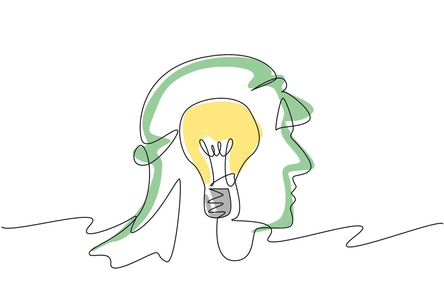 Continuous one line drawing the head is made of wires and in the middle of the head there is lightbulb. Accumulating many thoughts. National Creativity Day. Single line draw design illustration Pro Vector