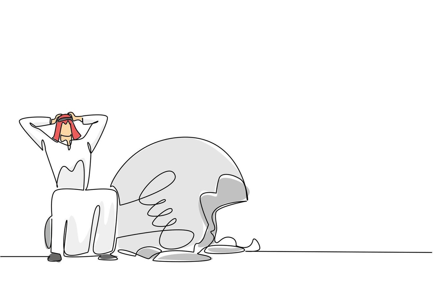 Continuous one line drawing Arabian businessman sits on broken lightbulb with both hands holds head. Such deep regret. Failure. National Creativity Day. Single line draw design illustration Pro Vector