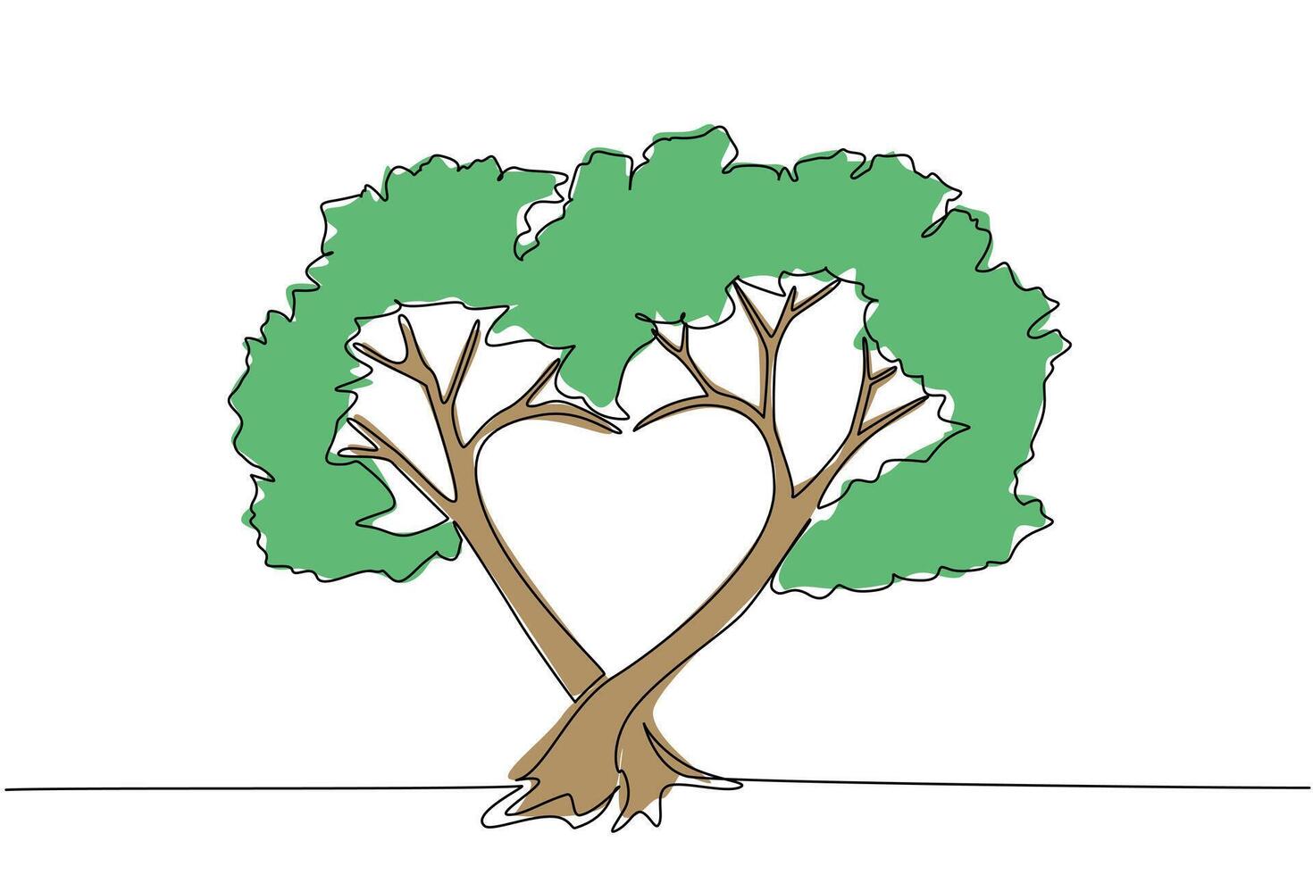 Single continuous line drawing leafy tree with the middle of the branches forming love shape. A very shady tree that is cared for with all the heart. Tree Concept. One line design illustration Pro Vector