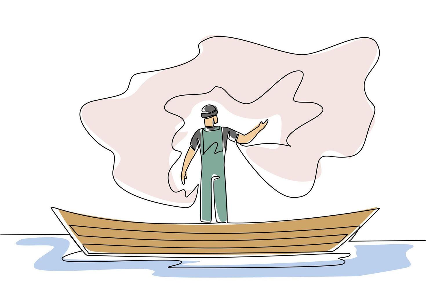 Single one line drawing a man wearing a hat standing on a wooden boat while casting a net. Serious preparation before harvesting. Fisherman Hold Fish. Continuous line design graphic illustration Pro Vector