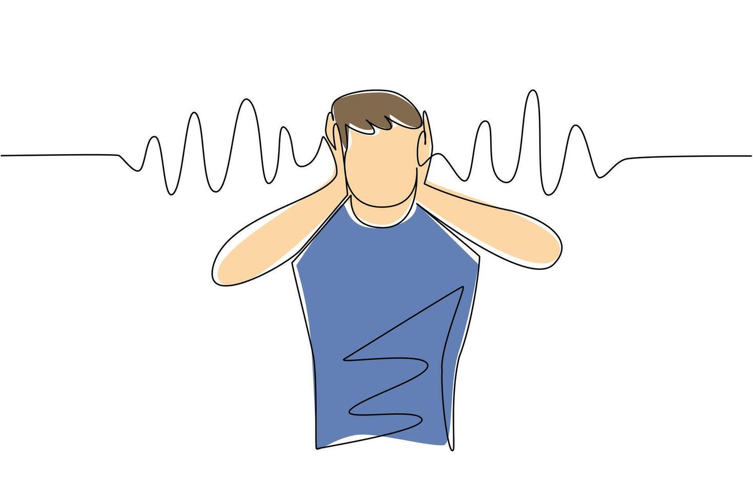 Continuous one line drawing a man in casual clothes holds ears with both hands and sound wave effects. Do not like noise. National Save Your Hearing Day. Single line draw design illustration Pro Vector
