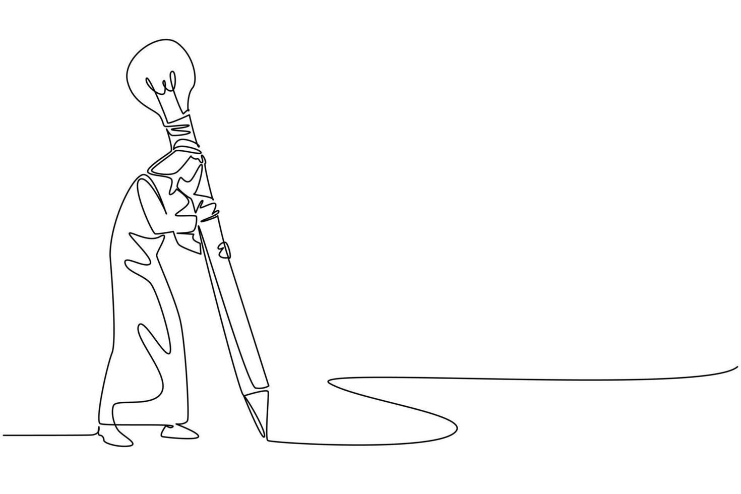 Single continuous line drawing Arab man writes using big pencil with lightbulb at the end. The best ideas neatly copied through writing. National Creativity Day. One line design Pro Vector