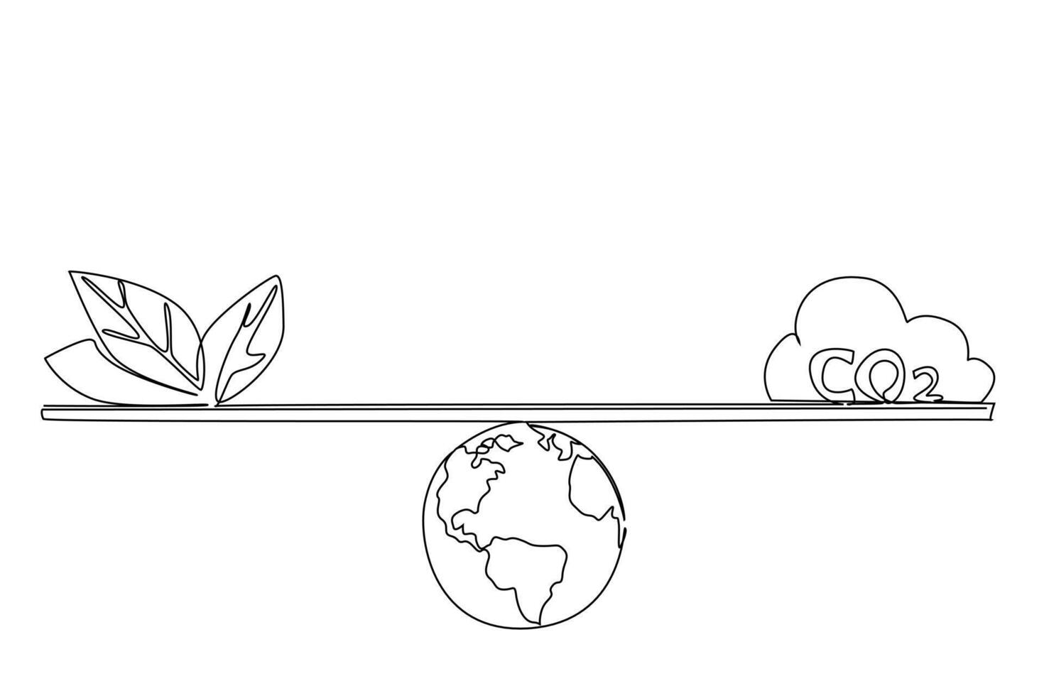 Single continuous line drawing scales with globe as the fulcrum with leafy leaves and clouds labeled CO2. Natural balance for a good earth. Friendly. Tree Concept. One line illustration Pro Vector