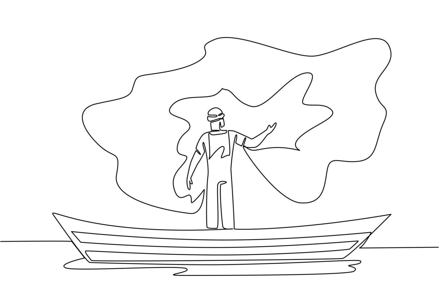 Single one line drawing a man wearing a hat standing on a wooden boat while casting a net. Serious preparation before harvesting. Fisherman Hold Fish. Continuous line design illustration Pro Vector