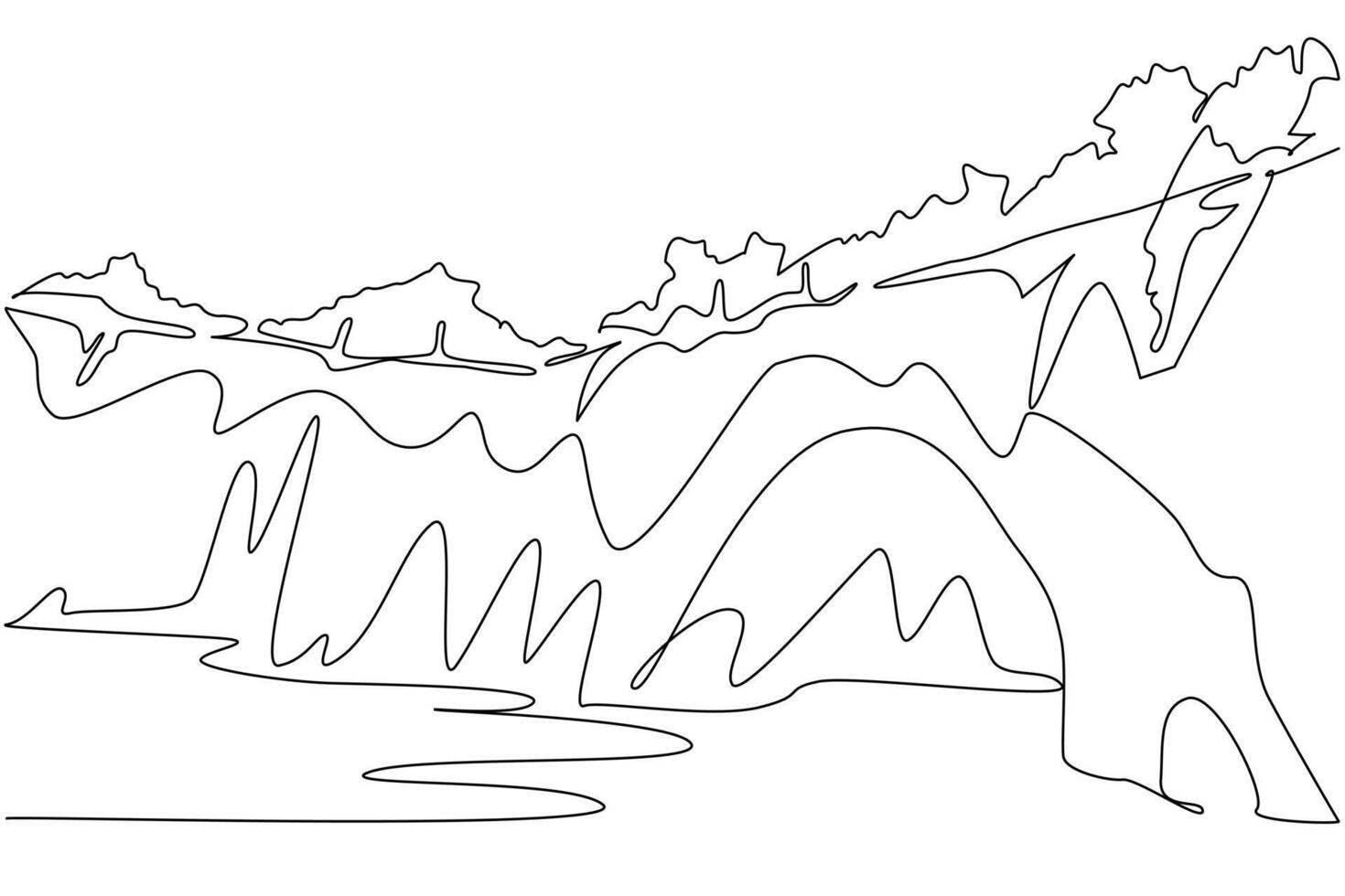 A continuous line drawing of a karst bridge formation with rocks, river, and trees, created as a nature concept to illustrate National Caves and Karst Day in an elegant abstract style. Pro Vector