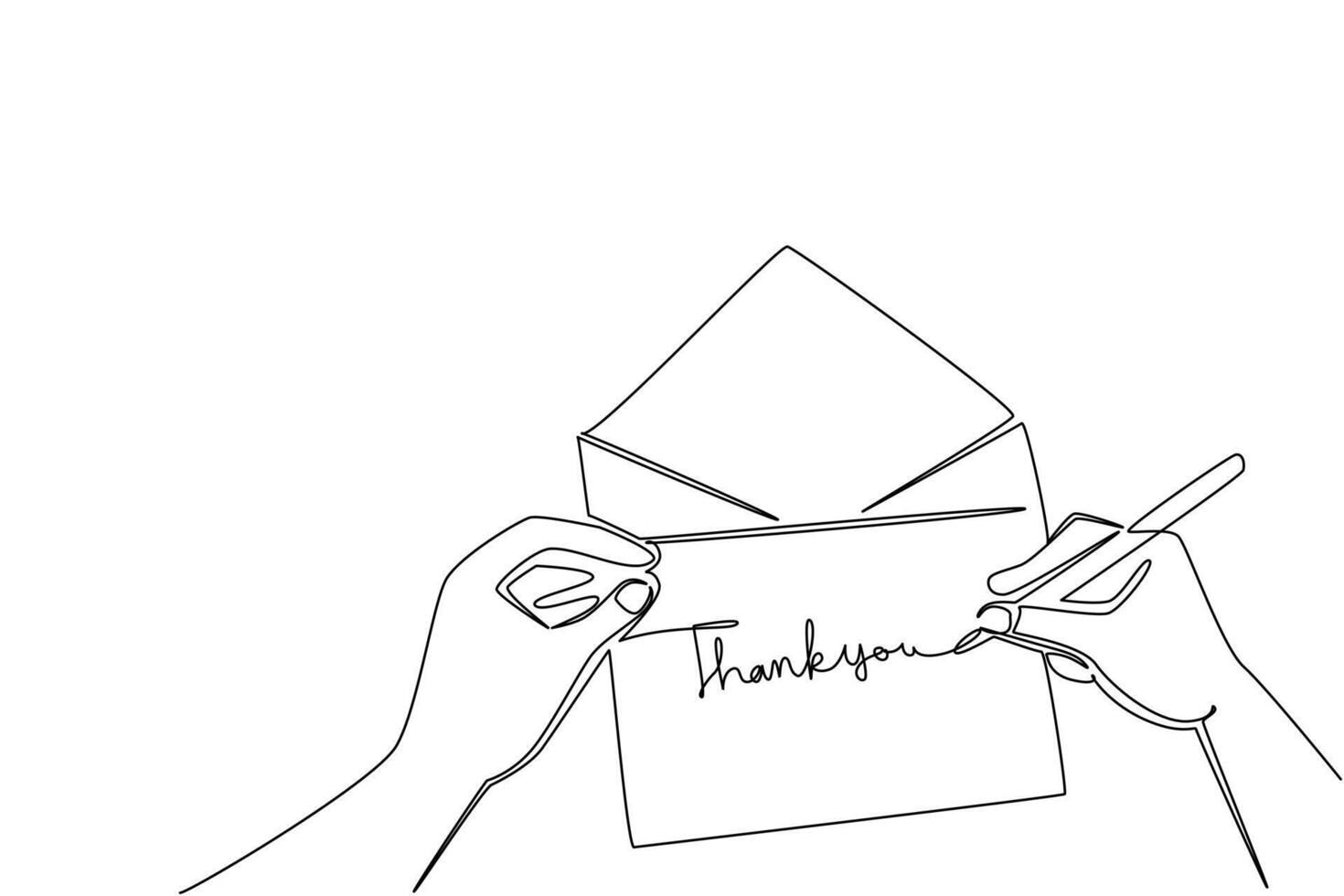 A creative continuous line drawing of hands writing a thank you card in an envelope, representing personal gratitude and thoughtful gestures as part of a touching business concept for Thank You Day. Pro Vector