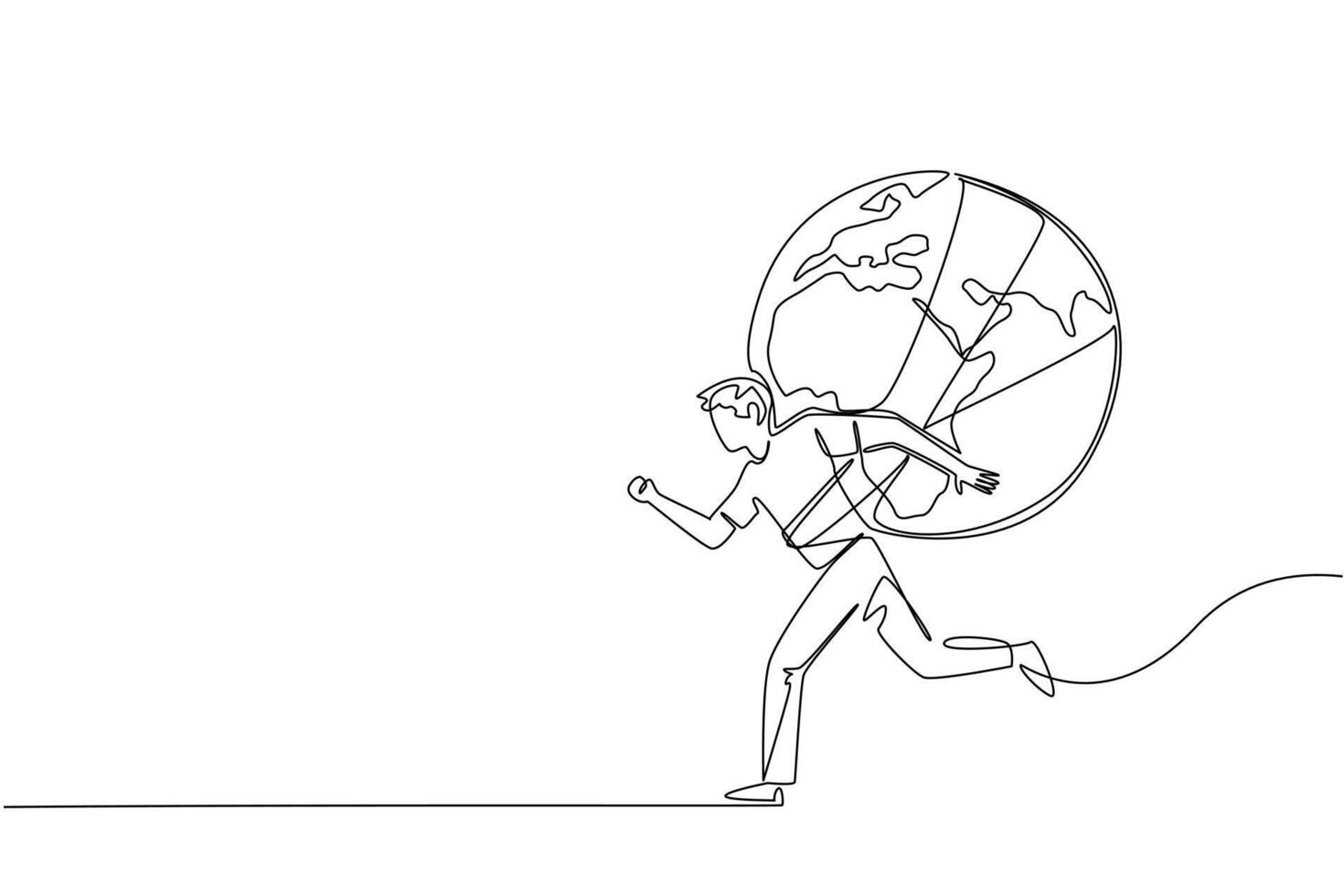 Continuous line drawing of a man carrying the globe while running, created for Global Running Day to represent unity, endurance, and passion in a worldwide sport concept. Pro Vector