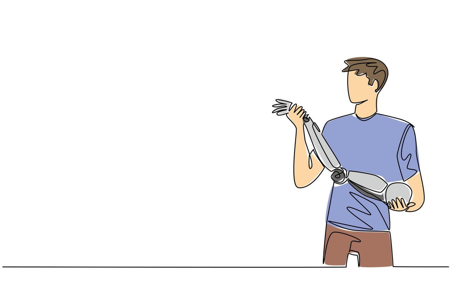 Continuous line drawing of a man holding a robotic prosthetic arm, representing innovation in assistive health technology and inclusion for World Day for Assistive Technology science concept. Pro Vector