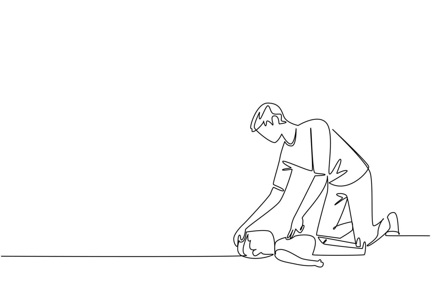 Continuous line drawing of a man checking the airway of a patient lying on the ground, illustrating health concept for National CPR and AED Awareness to encourage quick emergency response. Pro Vector