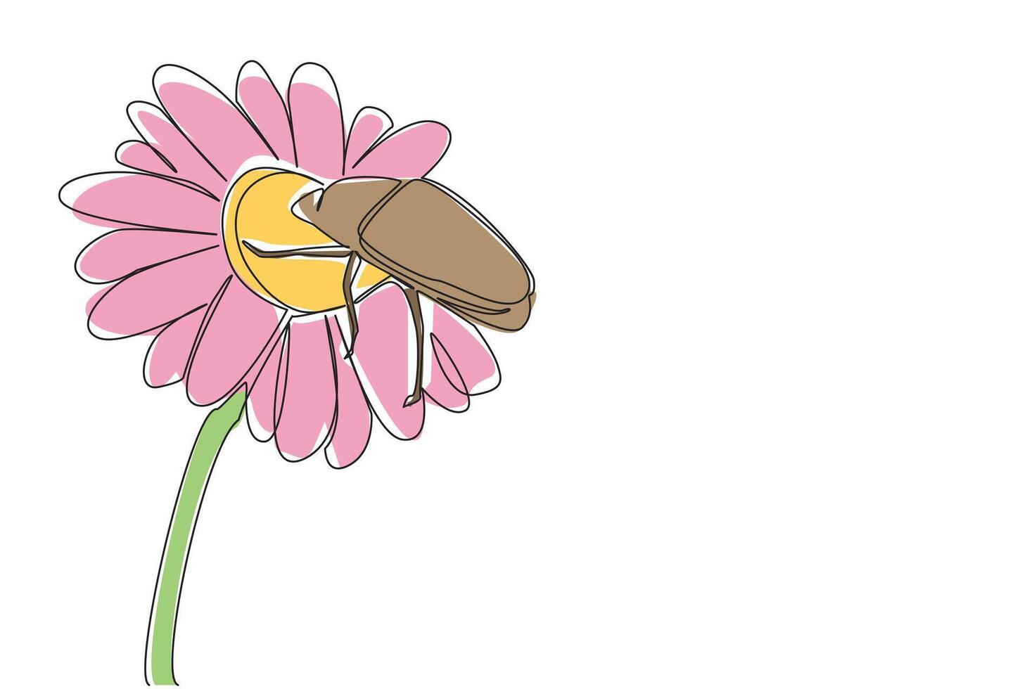 Simple continuous line drawing of a june bug on a daisy flower, symbolizing nature concept and insect life, created to celebrate June Bug Day as an international event design theme. Pro Vector