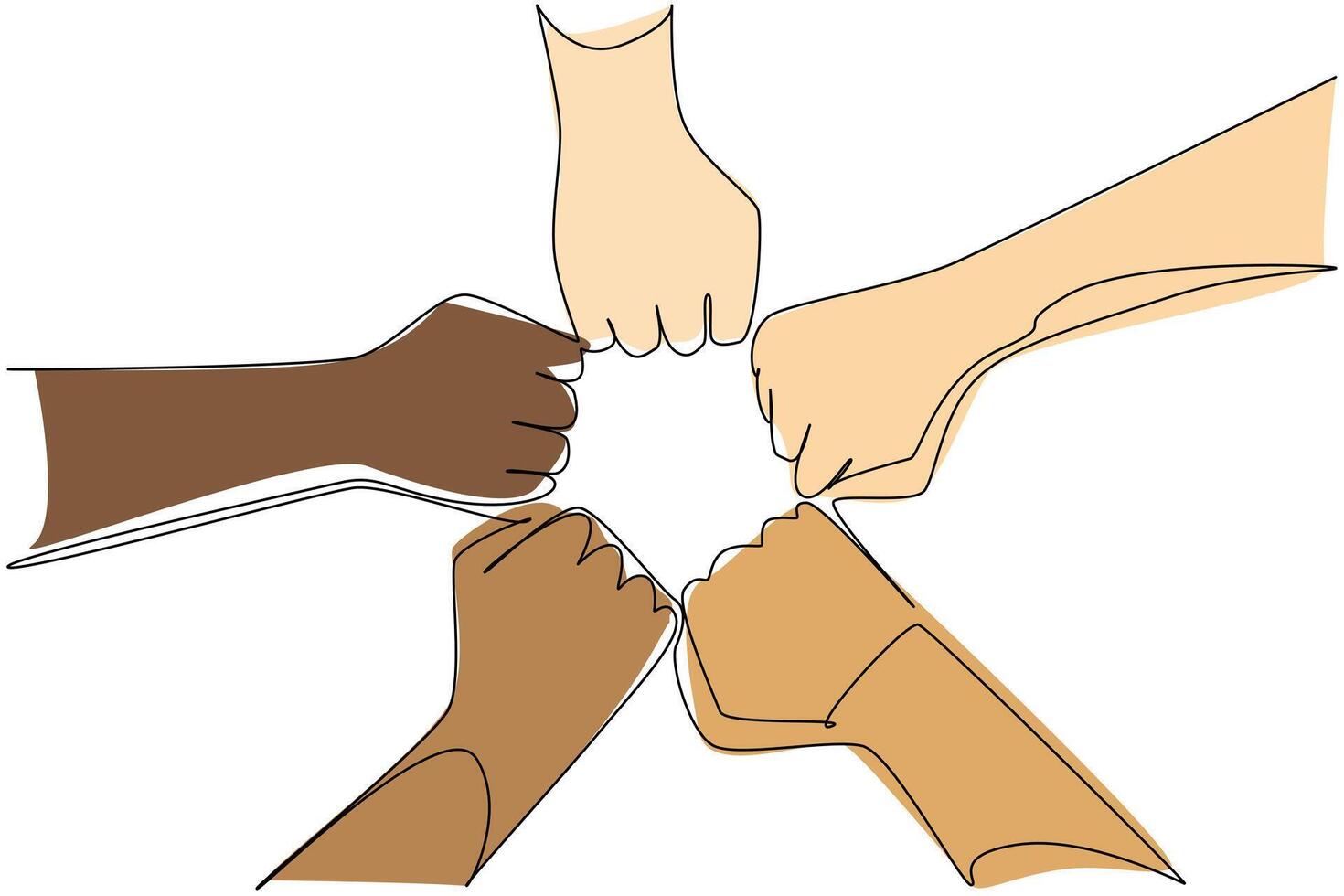 A continuous line drawing of multiple race fists joined in a circle illustrates empowerment, solidarity, and unity for Race Unity Day, honoring global equality, justice, and human rights. Pro Vector