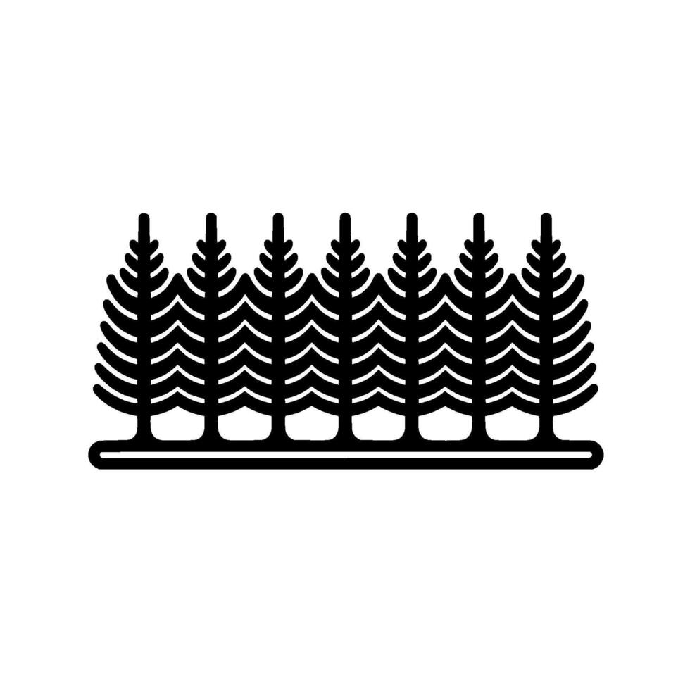 A stylized minimalist depicting a symmetrical row of seven evergreen pine trees with distinct needle patterns standing Pro Vector