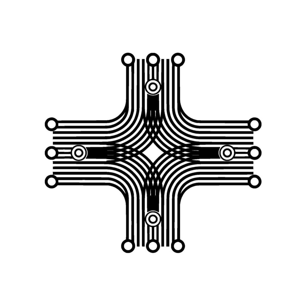 Abstract symmetrical depicting interconnected circuit board pathways forming a cross shape with concentric circles at junctions and endpoints Pro Vector