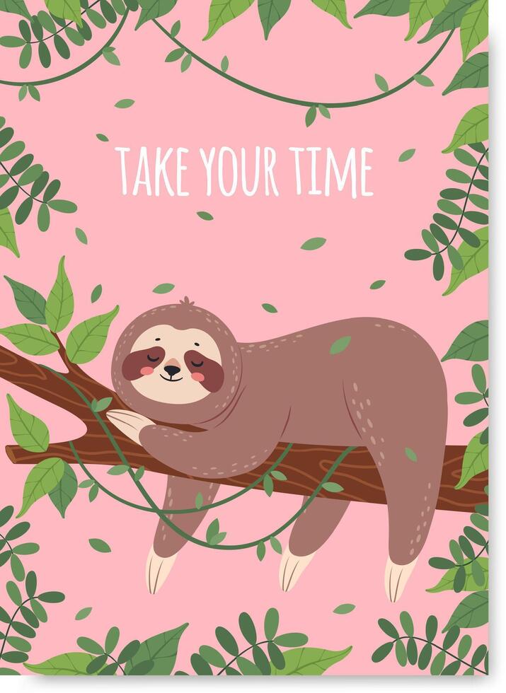 Cute sleeping sloth relaxing on branch with take your time message Pro Vector