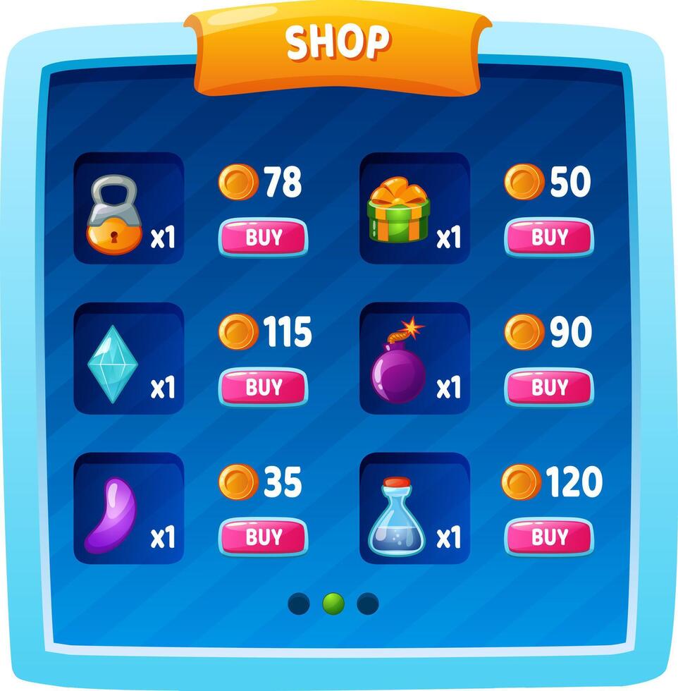 Game shop interface displaying items for in app purchase Pro Vector