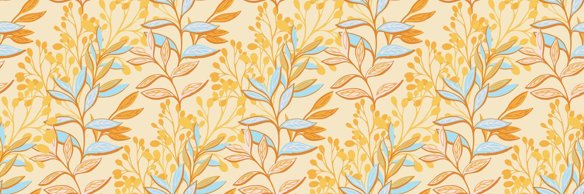 Seamless pattern featuring intertwined botanical branches with delicate leaves in warm gold, soft pink, and cool blue tones, creating an elegant ornamental nature inspired design Pro Vector