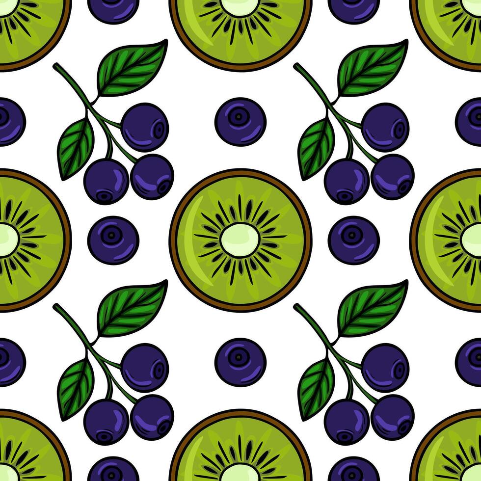 A vibrant and refreshing seamless pattern featuring stylized kiwi slices and clusters of blueberries with green leaves on a clean white background. Pro Vector