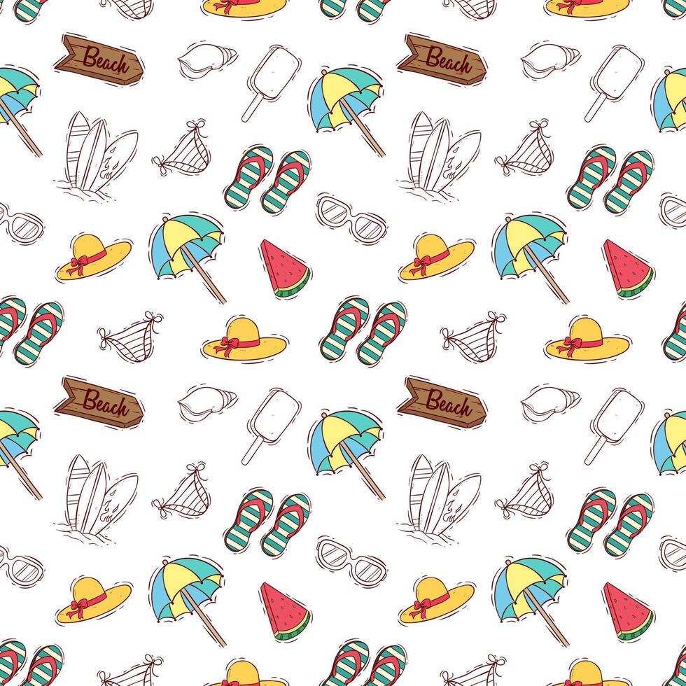 Seamless pattern of summer elements such as watermelon, bikini, umbrella, and flip-flops, using a doodle drawing style vector
