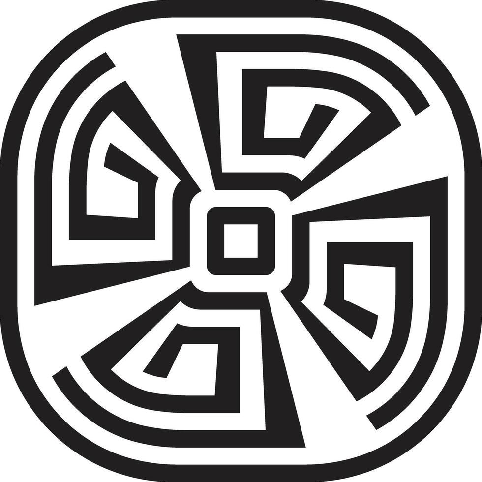 Abstract geometric labyrinth symbol in black and white, forming a complex, modern pattern. Pro Vector