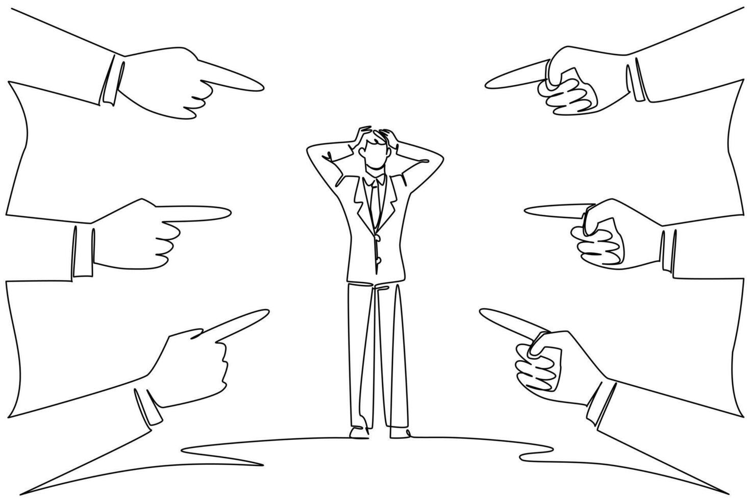 One line drawing of a distressed business man clutching his head, surrounded by multiple hands pointing fingers at him, symbolizing intense blame or pressure. National Blame Someone Else Day event Pro Vector