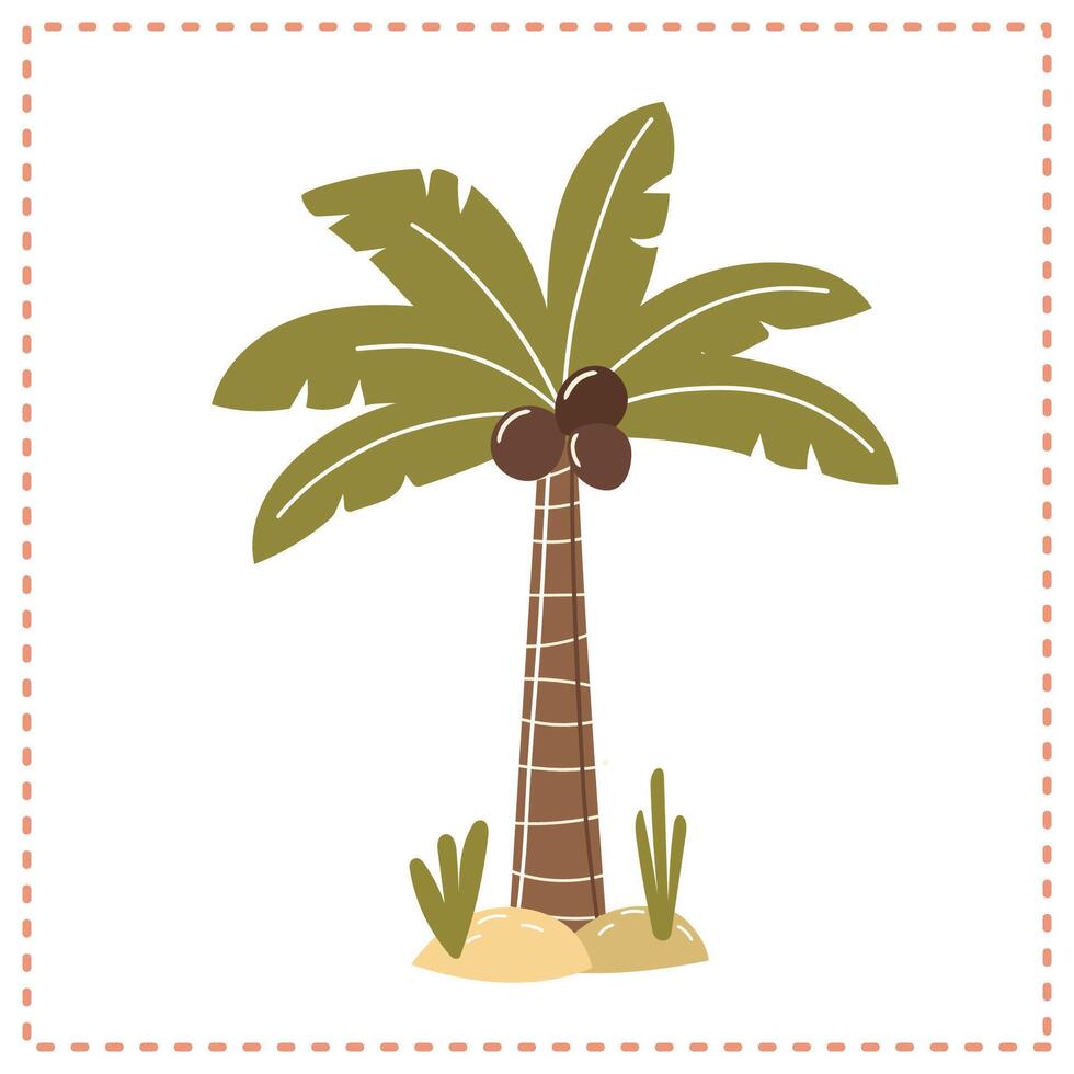 Cartoon palm tree illustration on a sandy beach, ideal for tropical palm tree with coconuts on a sandy beach setting in a minimalist design Pro Vector