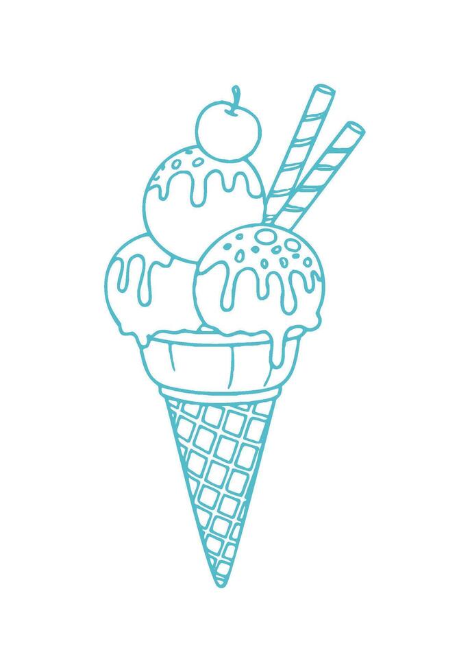 An outline drawing showcases three scoops of ice cream in a cone, topped with drizzle, a cherry, and wafer sticks. Pro Vector