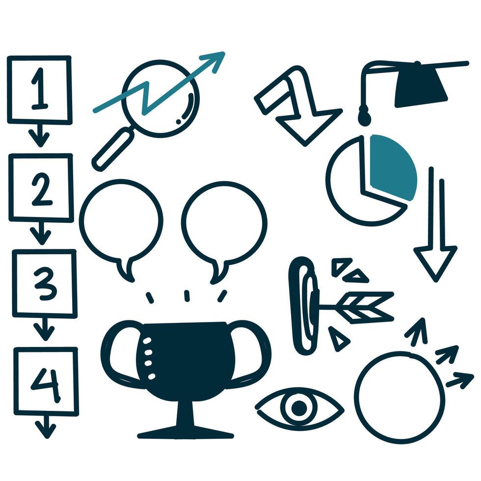 a set of icons that include a trophy, a speech bubble, and arrows Pro Vector