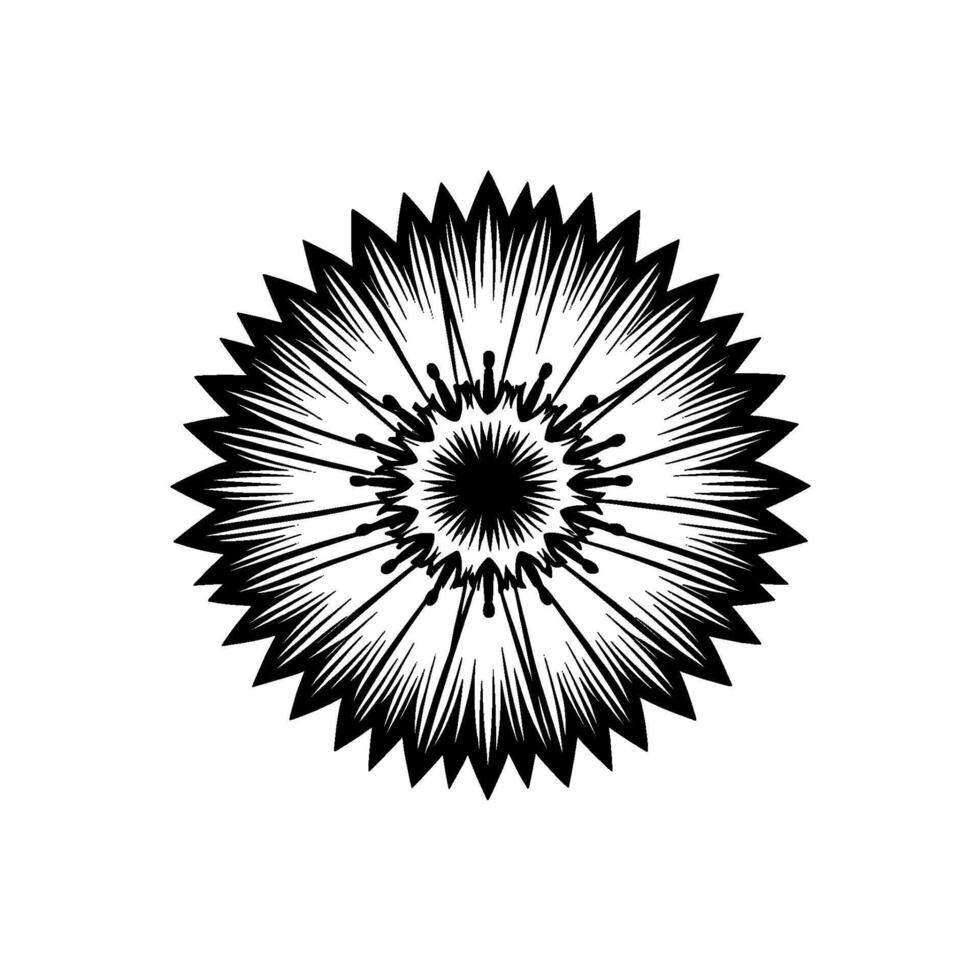 A striking abstract illustration of a stylized starburst flower or sun motif with sharp radiating lines and a central dark core vector