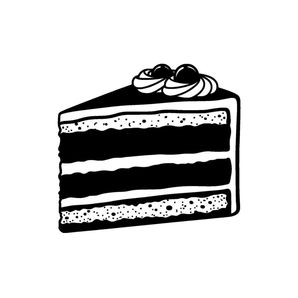 A detailed illustration of a decadent slice of chocolate cake with three layers of dark chocolate frosting and vanilla cream filling topped with swirling frosting and two dark cherries vector