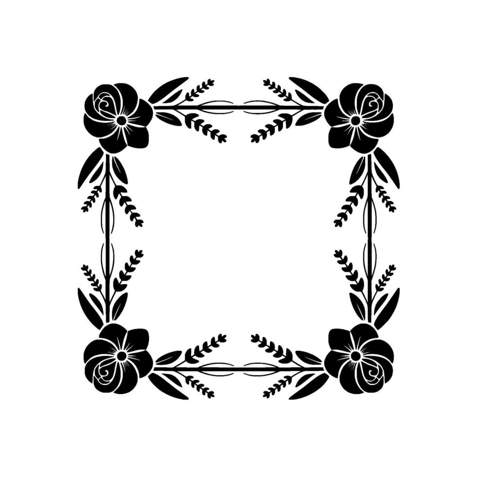 Elegant silhouette of a square floral frame composed of stylized roses and leafy branches arranged in a symmetrical pattern Pro Vector