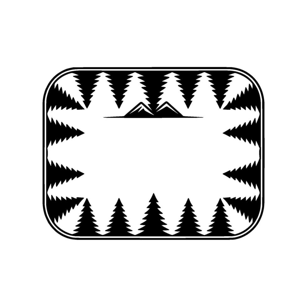 A minimalist or emblem featuring a stylized mountain range and surrounding pine trees within a rounded rectangle border Pro Vector