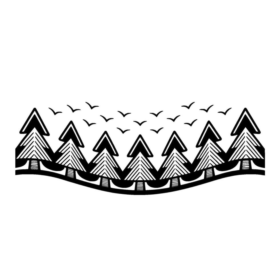 A stylized illustration of a row of coniferous trees with patterned branches above a curved line and a flock of small birds flying in the sky Pro Vector