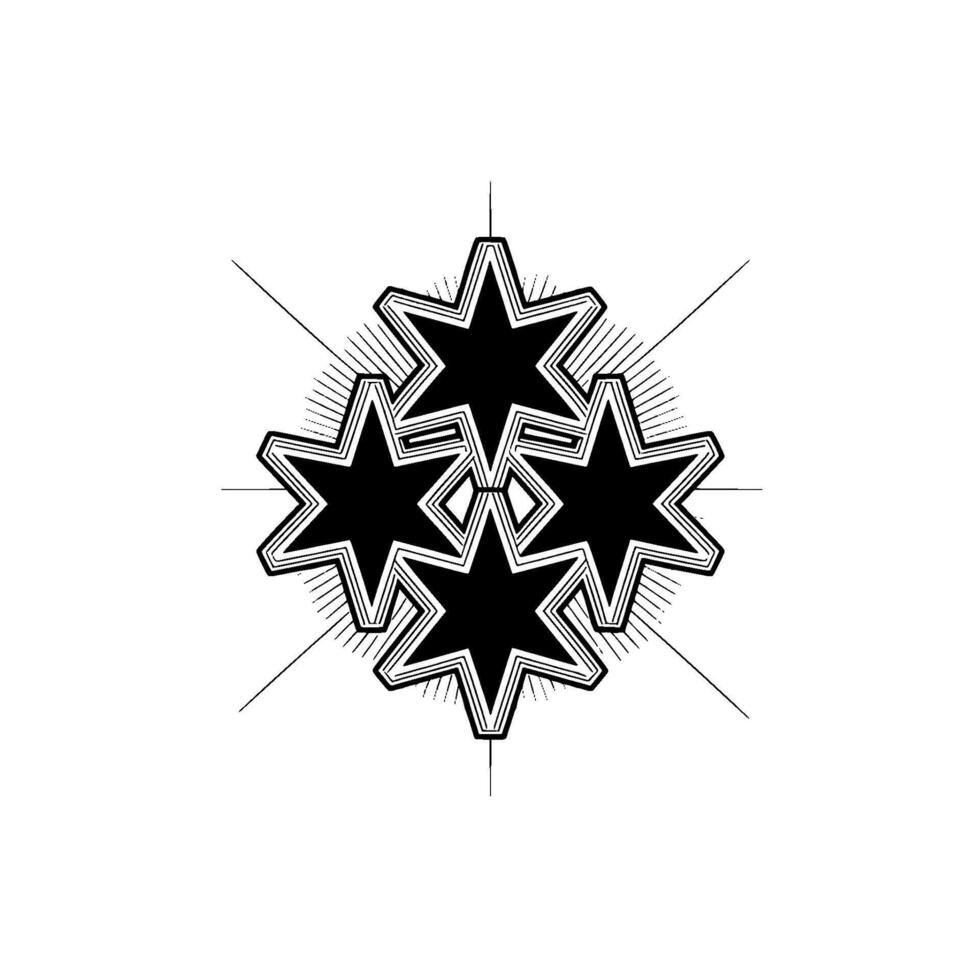 Geometric arrangement of three overlapping seven pointed stars with sharp angular edges and concentric outlined details Pro Vector