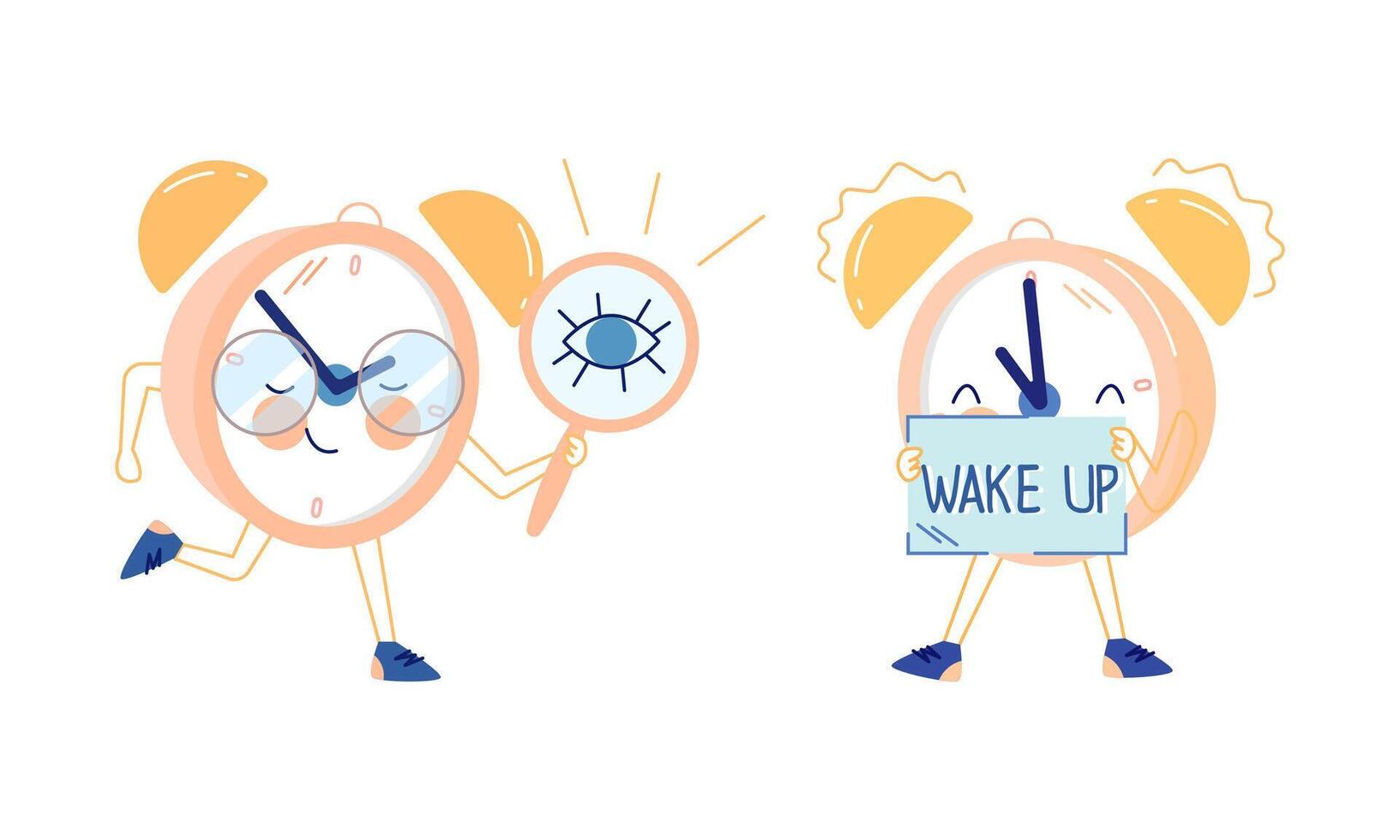 Funny Clock Character in Glasses Running with Magnifying Glass and Waking Up Set Pro Vector