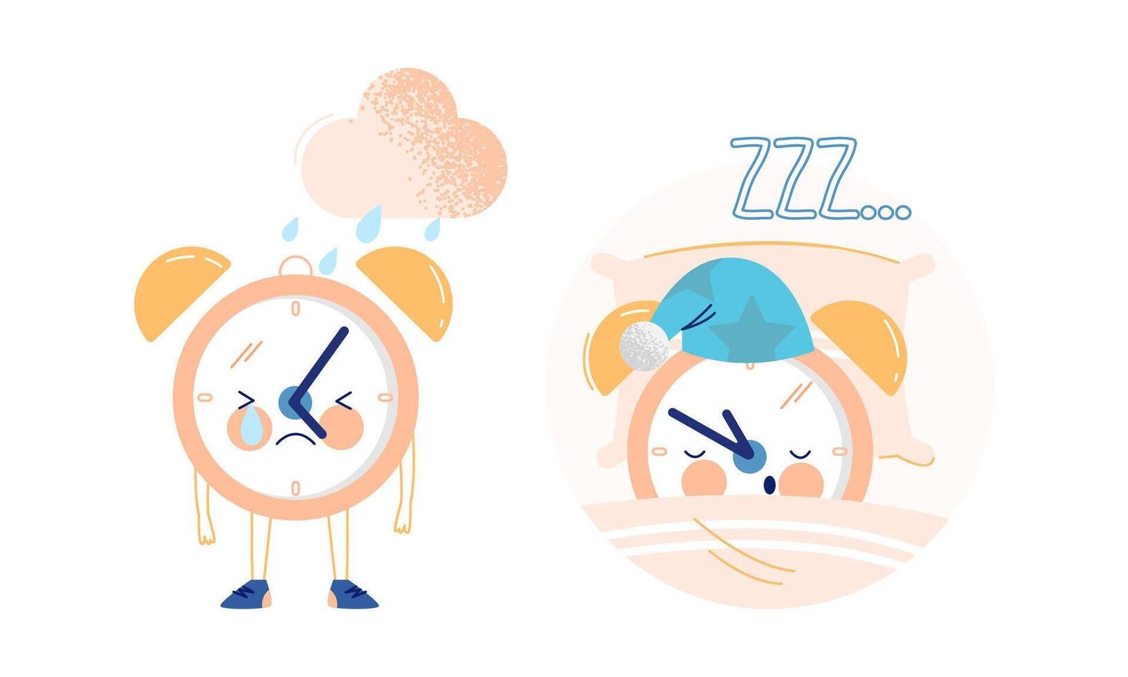 Funny Clock Character Crying with Rain and Sleeping in Bed on Pillow Set Pro Vector